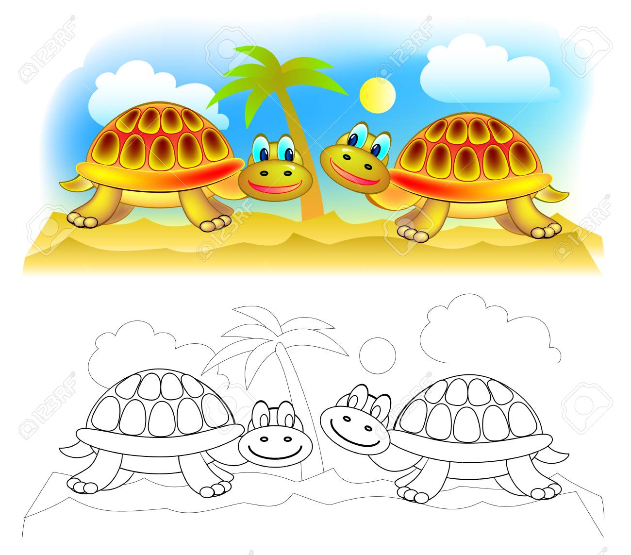 Fantasy Illustration Of Couple Cute Turtles In Desert Colorful